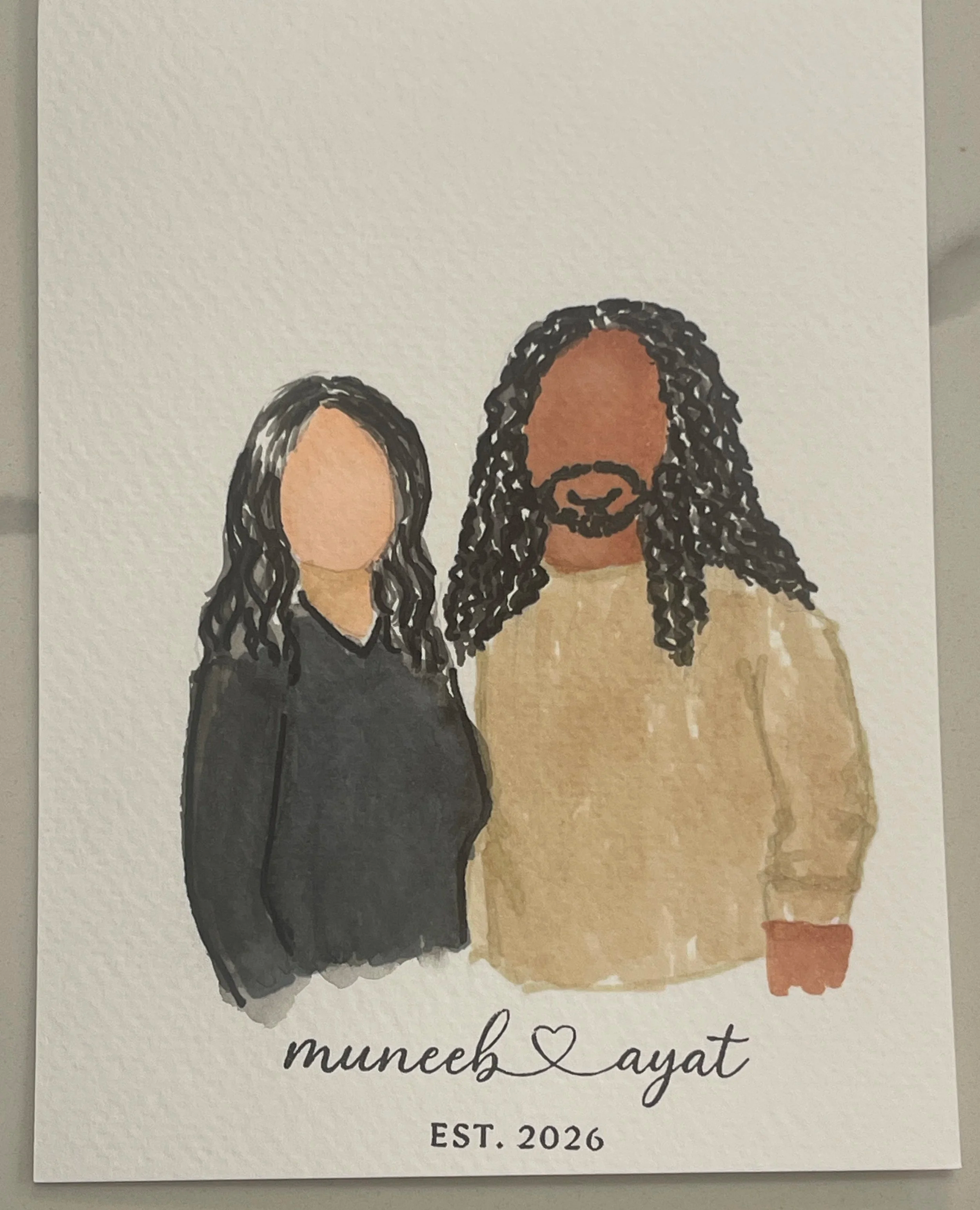 During your reception, guests are invited to pose for a custom illustration. A select number are sketched live during the celebration, creating an interactive artistic experience your guests can watch unfold. The remaining portraits are thoughtfully completed in the studio after the wedding to ensure each illustration is beautifully finished.