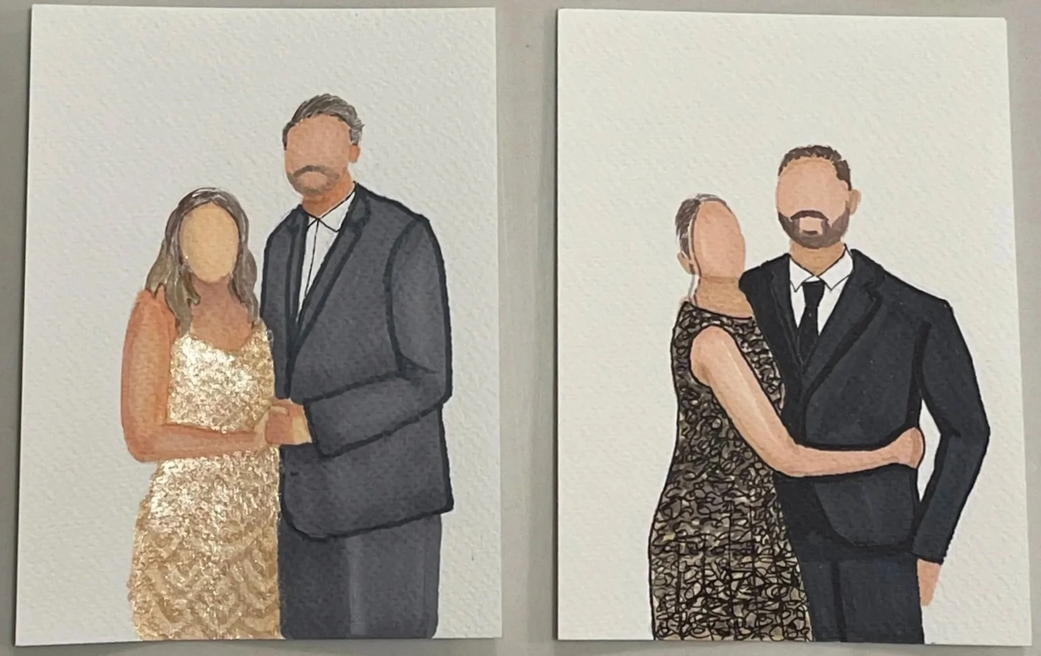 Because each illustration is created by hand, a limited number can be completed live during the wedding. I will provide an estimate for you based on hours of service. Additional guest portraits are finished in the studio afterward, allowing every piece to receive the time and attention it deserves.